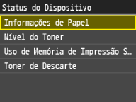 , é exibida uma tela que lhe permite verificar o status de documentos que estão sendo impressos, enviados ou recebidos, assim como o status da máquina, por exemplo, quanto aos níveis de toner, ou as informações de definições de rede como, por exemplo, o endereço IP da máquina.