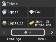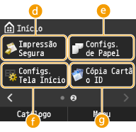 ![]() | <Impressão Segura>Toque ao dar início à impressão de documentos protegidos. Imprimindo um documento protegido por um PIN (Impressão protegida) <Configs. de Papel>Exibe uma tela para especificar as configurações do papel. Carregando papel <Configs. Tela Início>Exibe a tela para a personalizar a Tela inicial. Personalizando a Tela inicial <Cópia do Cartão ID>Exibe a configuração para copiar frente e verso de um cartão em uma única folha de papel. Copiar os dois lados de um cartão ID em uma página |