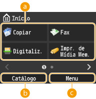 ![]() | Botões de seleção de funçãoToque para ativar as funções imprimir USB, scanner, cópia ou fax. <Catálogo>Toque para exibir todos os destinos registrados no Catálogo de endereços. Registrando no Catálogo de endereços <Menu>Exibe um menu para configurações disponíveis com a máquina. Definindo a lista de menu |