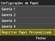 Na tela para a especificação do tamanho do papel carregado nas gavetas de papel, os tamanhos de papel registrados são exibidos.