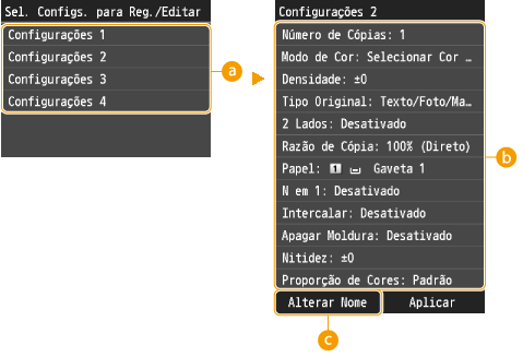 Você pode registrar até quatro combinações de configurações de cópia frequentemente usadas. Selecionando simplesmente uma combinação de configurações favorita registrada, quando necessário, você pode eliminar a necessidade de definir as mesmas configurações a cada vez que fizer cópias, tal como se você define frequentemente o número de cópias para 5, defina <Apagar Moldura> para <Ativado> e aumente a nitidez ao copiar. Você pode registrar as combinações de configurações com qualquer nome.