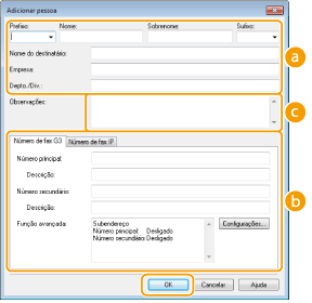 [Número de fax]Insira o(s) número(s) de fax. Hifens podem ser inseridos entre os números conforme o necessário. Se você deseja adicionar explicações sobre o uso dos números de fax, como "Casa" ou "Escritório", insira-as em [Descrição].