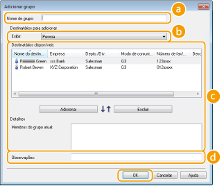 [Destinatários disponíveis]Selecione os destinos a registrar em Discagem de grupo e clique em [Adicionar]. Os destinos selecionados são exibidos em [Membros do grupo atual].