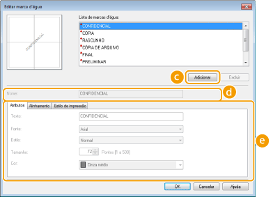 Clique em cada guia para especificar o texto, a cor, ou a posição de impressão da marca d'água. Para mais informações, clique em [Ajuda] na tela do driver de impressora.