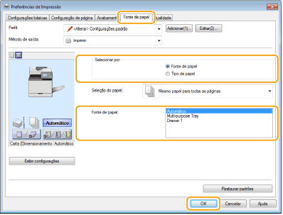 Selecione a fonte de papel carregada com o papel no qual você deseja imprimir em [Fonte de papel]