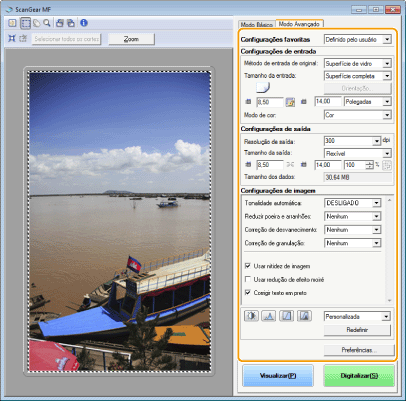 Se você clicar na guia [Modo Avançado] na tela ScanGear MF, você pode criar mais ajustes avançados na qualidade da imagem do que é possível no Modo simples. Você também pode registrar configurações ajustadas como Configurações favoritas. Para obter informações detalhadas, clique no ícone