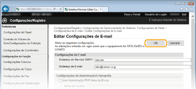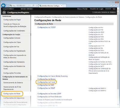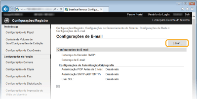 Use a IU remota para configurar as definições de e-mail detalhadas. Para mais informações sobre as configurações necessárias, entre em contato com seu servidor de serviço de internet ou Administrador de rede.