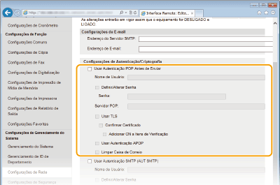 Marque a caixa de seleção para usar o TLS para codificar a comunicação com o servidor SMTP. Marque a caixa de seleção para [Confirmar Certificado para Envio SMTP] ou [Adicionar CN a Itens de Verificação] dependendo de suas necessidades.
