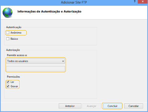 5 | Selecione [Ler] e [Gravar] para [Permissões] clique em [Concluir]. |