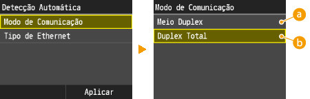2 | Toque no modo de comunicação. Toque <Modo de Comunicação> <Meio Duplex> ou <Duplex Total>.![]() <Meio Duplex>Envia e recebe dados de comunicação de forma alternativa. Selecione-a quando a máquina estiver conectada a um dispositivo de rede usando half duplex. <Duplex Total>Envia e recebe simultaneamente dados de comunicação. Use essa definição para a maioria dos ambientes. |