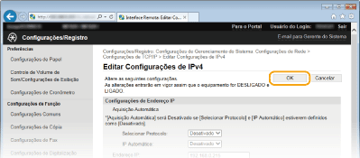 2 | Configure as definições de DNS do IPv4. ![]() [Configurações de DNS][Endereço Servidor DNS Primário] Digite o endereço IP de um servidor DNS. [End. Servidor DNS Secundário] Digite o endereço IP de um servidor DNS, se houver algum. [Nome de Host] Digite até 47 caracteres alfanuméricos para o nome do host da máquina que será registrada ao servidor DNS. [Nome de Domínio] Digite até 47 caracteres alfanuméricos para o nome do domínio pertencente à máquina, como "exemplo.com." [Atualização de DNS Dinâmico] Marque a caixa de seleção para atualizar dinamicamente os registros de DNS se o endereço IP da máquina for alterado. Ao especificar o intervalo entre as atualizações, insira o tempo em horas na caixa de texto [Intervalo de Atualização de DNS Dinâmico]. [Configurações de mDNS][Usar mDNS] Adotado pelo Bonjour, o mDNS (DNS multicast) é um protocolo para associar um nome de host com um endereço IP sem usar o DNS. Marque a caixa de seleção para ativar o mDNSe digite o nome mDNS na caixa de texto [Nome de mDNS]. [Configurações de Opção DHCP][Adquirir Nome de Host] Marque a caixa de seleção para ativar a Opção 12 para obter o nome de host do servidor DHCP. [Atualização de DNS Dinâmico] Marque a caixa de seleção para ativar a Opção 81 para atualizar dinamicamente os registros DNS através do servidor DHCP. |