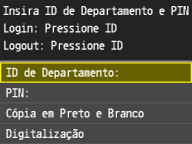 Usando o painel de operaçõesSe você deseja apenas ativar ou desativar as definições, é possível usar <Menu> o painel de operações. Rel. Ger. ID Depto. Ativ./Des. Fazendo o logon na máquinaSe você tentar operar a máquina quando a Gestão ID Depart. estiver ativada, a seguinte tela de logon será exibida: | | |