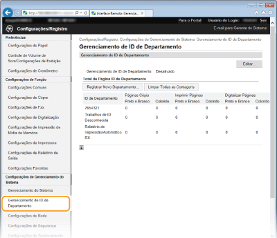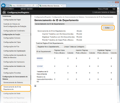 Clique em [Gerenciamento de ID de Departamento] e registre (ou edite) IDs de departamento.