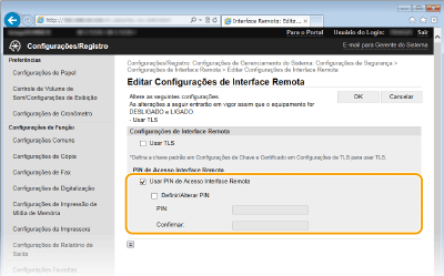 Se você esquecer o PINConfigure um novo PIN de acesso à IU remota no menu de configurações do painel de operação. Realize a seguinte operação na máquina: <Menu> <Configurações de Gerenciamento do Sistema> <Configurações de Interface Remota> <Configurações de Segurança de Acesso à IU Remota> <Ativado> Inserir PIN <Aplicar> Inserir PIN (Confirmar) <Aplicar>.Se as configurações da IU remota forem inicializadasO PIN de acesso da IU remota também é inicializado. Após uma inicialização, redefina o PIN. Menu de inicialização |
