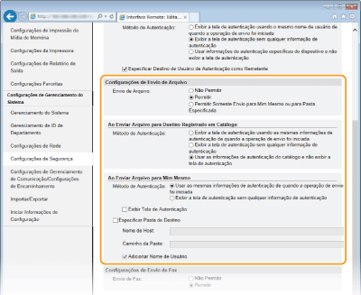 [Envio de Arquivo]Defina a permissão para salvar em pastas compartilhadas e servidores de arquivo. Selecione [Permitir Somente Envio para Mim Mesmo ou para Pasta Especificada] para permitir salvar os dados somente em seu endereço ou em um pasta específica.