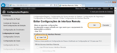 Usando o painel de operaçõesVocê pode ativar ou desativar a comunicação codificada TLS em <Menu>. Usar TLS Iniciando a IU remota com TLSSe você tentar iniciar a IU remota quando o TLS está ativado, um alerta de segurança sobre o certificado de segurança pode ser exibido. Neste caso, verifique se a URL correta foi digitada no campo de endereço e depois prossiga para exibir a tela da IU remota. Iniciando a IU remotaAtivando o TLS para envio de e-mailsSe os servidores SMTP e POP3 suportam TLS, você pode ativar o TLS para a comunicação com estes servidores ( Definindo as configurações de e-mail). Para mais informações sobre o servidor SMTP e POP3, entre em contato com seu provedor de serviços de internet ou Administrador de rede. |