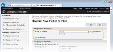 Se [Configurações Manuais de IPv4] ou [Configurações Manuais de IPv6] é selecionado para [Endereço Remoto], insira o endereço IP para aplicar a política. Você pode também inserir um intervalo de endereços colocando um hífen entre os endereços.