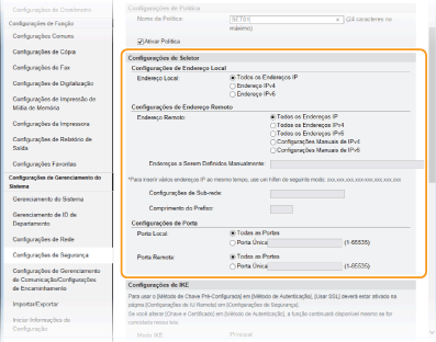 O seletor define as condições para pacotes IP aplicarem a comunicação IPSec. Condições selecionáveis incluem endereço IP e números de porta da máquina e os dispositivos com os quais se comunicar.