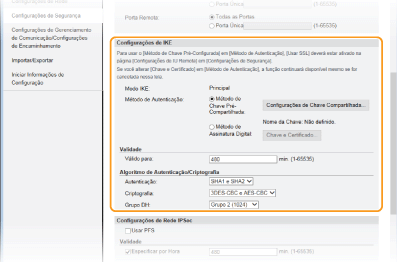 [Autenticação ESP] | Para ativar a autenticação ESP, selecione [SHA1] para o algoritmo hash. Selecione [Não Usar] se você deseja desativar a autenticação ESP. |