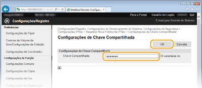 Selecione [Método Chave Pré-Compartilhada] ou [Método de Assinatura Digital] para o método usado ao autenticar a máquina. Você precisa ativar o TLS para a IU remota antes de selecionar [Método Chave Pré-Compartilhada] (