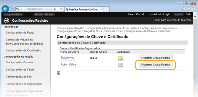 2 | Clique em [Registrar Chave Padrão] à direita de um par de chaves que você deseja usar.  Visualizando detalhes de um par de chaves ou certificadoVocê pode conferir detalhes do certificado ou verificar o certificado clicando no link de texto correspondente sob [Nome da Chave], ou no ícone do certificado. Verificando os pares de chaves e certificados e chaves de assinatura do dispositivo |