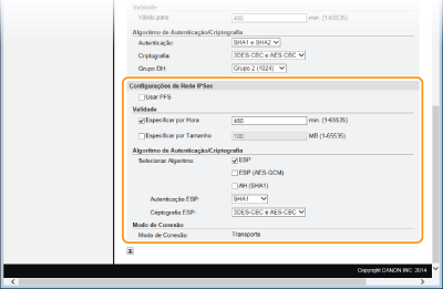 Selecione a(s) caixa(s) de seleção [ESP], [ESP (AES-GCM)], ou [AH (SHA1)] dependendo do cabeçalho IPSec e do algoritmo usado. AES-GCM é um algoritmo tanto para autenticação como para codificação. Se [ESP] for selecionado, selecione também algoritmos para autenticação e codificação nas listas [Autenticação ESP] e [Criptografia ESP].