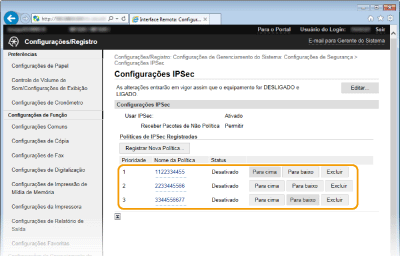 As políticas são aplicadas da posição mais alta para a posição mais baixa. Clique em [Para cima] ou [Para baixo] para mover a política para cima ou para baixo na ordem.