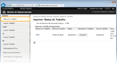 Independente da configuração Gestão ID Depart., todos os documento sendo impressos atualmente ou aguardando para serem impressos será exibida. Se você inseriu seu nome de usuário ao fazer logon no modo Usuário final, seu nome de usuário somente será exibido nos documentos que você imprimiu. Clique em [Número do Trabalho] nos documentos pausados e documentos protegidos para exibir informações detalhadas. Você pode verificar o nome de usuário e a contagem de página do documento impresso. |