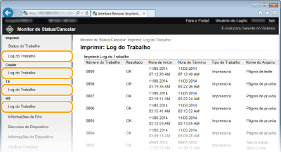O histórico de impressões, cópia, envio de faxes/e-mails (TX), ou recepção de faxes (RX) é exibido com até 128 trabalhos.
