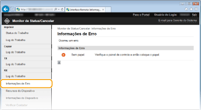 Quando ocorre um erro, está página será exibida ao clicar na mensagem exibida em [Informações de Erro] na página Portal (página principal).