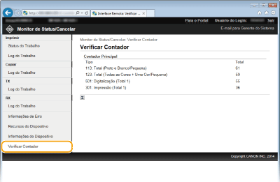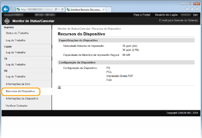 Informações sobre a máquina e o administrador sistema são exibidas. Estas informações são definidas em [Gerenciamento do Sistema] na página [Configurações/Registro].