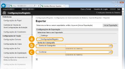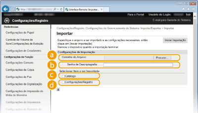 Você pode salvar os dados das opções de menu em seu computador, ou registrar os dados salvos na máquina. Os dados exportados podem ser importados. Se for usado o mesmo modelo, outras máquinas podem importar os dados exportados dessa máquina e vice-versa. Estas operações podem ser desempenhadas somente quando você estiver logado no modo Administrador Sistema.