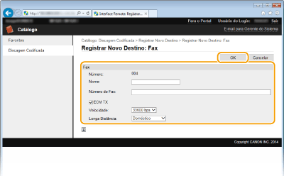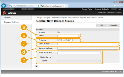 2 | Digite as informações solicitadas. ![]() [Nome]Digite o nome do destino. [Protocolo][Windows(SMB)]: Selecione ao usar uma pasta compartilhada. [FTP]: Selecione ao usar um servidor de arquivo. [Nome de Host]Para usar uma pasta compartilhada, digite o caminho desta (até 120 caracteres) ou digite o endereço de IP (exemplo: \\swan\share or \\192.168.2.100\share). Para usar um servidor de arquivo, digite o endereço de IP para o servidor do FTP (até 120 caracteres) (exemplo: \ \192.168.2.100\share). ![]() Usando um servidor DNS Você também pode especificar o nome de host para a pasta compartilhada no seguinte formato. \\host_name.organization.company.co.jp\share Você pode usar o nome completo do computador para o nome de host do servidor do arquivo. starfish.organization.company.com Se os idiomas de exibição para o computador e para a IU Remota forem diferentes [Nome de Host] ou [Caminho da Pasta] não pode ser exibido corretamente ou pode não ser consultável. [Caminho da Pasta]Digite um nome de pasta (até 120 caracteres) como um destino para os dados. [Nome de Usuário]/[Senha]Defina o nome de usuário e a senha definidos no computador. ![]() Formatos para especificar o nome de usuário (pasta compartilhada) nomede_domínio\nomede_usuário (até 32 caracteres): Especificar o nome de usuário neste formato fornece privilégios ao usuário no domínio especificado para a comunicação SMB. nome_do_usuário@company.com (até 32 caracteres todos juntos): Este formato somente pode ser especificado ao enviar para Windows Server 2003/Server 2008/Vista/7/Server 2008 R2/8/8.1/Server 2012/Server 2012 R2 que pertença a um domínio cujo controlador de domínio seja Windows Server 2003/Server 2008/Vista/7/Server 2008 R2/8/8.1/Server 2012/Server 2012 R2. |