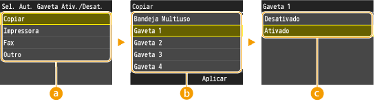 Ativar ou desativar o recurso de seleção automática da gaveta para as fontes de papel. Se a seleção automática da gaveta estiver definida como <Ativado> ao imprimir documentos, a máquina seleciona automaticamente uma fonte de papel que está carregada com o tamanho apropriado de papel. Além disso, quando o papel acaba, essa configuração permite a impressão contínua passando de uma fonte de papel para outra carregada com mesmo tamanho de papel. Você pode selecionar uma função, como cópia ou impressão, para permitir esse recurso.