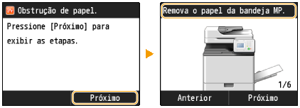 Se ocorrer um encravamento de papel, <Obstrução de papel.> será exibido na tela. Toque em <Próximo> para exibir soluções simples. Se for difícil entender os procedimentos no visor, consulte as seções a seguir para eliminar os encravamentos.