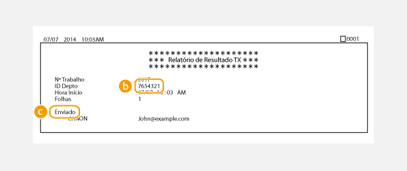 Por e-mail, o relatório result. TX indica o resultado de transmissão entre a máquina e o servidor de e-mail, não entre a máquina e o endereço de destino. Mesmo se a transmissão falhar, um código de erro de três dígitos não poderá ser impresso. Para verificar o código de erro, imprima um Relatório gestão comunicação.(