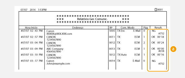 Quando um código de erro aparece). Por e-mail, os Relatórios gestão comunicação indicam o resultado da transmissão entre a máquina e o servidor de e-mail e não entre a máquina e o endereço de destino.