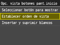 Agregar botones en blancoAl insertar un espacio en la ubicación actual de un botón, éste se moverá hacia atrás un lugar. Pulse <Opciones pan. inicio> <Insertar y suprimir blancos> para insertar espacios. Pulse el botón que desee mover y, a continuación, <Insertar> para insertar un espacio donde está el botón y mover el botón hacia atrás un lugar. |