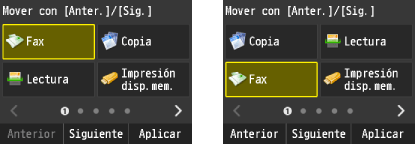 4 | Pulse <Anterior>/<Siguiente> para mover el botón hasta que se muestre en el lugar deseado. Al realizar un toque largo <Anterior>/<Siguiente> el botón se mueve hacia delante o atrás de forma continua. ![]() ![]() Después de seleccionar un botón, al pasar el dedo sobre la pantalla o usar / para cambiar las páginas, se desmarcará el botón. |