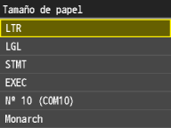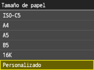 Si la pantalla anterior no aparece cuando hay papel cargadoSi siempre carga el mismo papel en la bandeja multiuso, puede omitir las operaciones de configuración del papel registrando el tamaño y el tipo de papel como opción predeterminada. Sin embargo, si se registra la opción predeterminada, la pantalla anterior no aparecerá. Para visualizar la pantalla, seleccione <Off> para <Guardar opciones prefijadas> (Registro de las opciones de papel predeterminadas para la bandeja multiuso). |