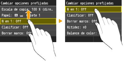 Puede cambiar diversas opciones relacionadas con la pantalla, como la velocidad de desplazamiento o el idioma: Tiempo para reinicio automático Para cambiar la pantalla que aparece automáticamente cuando el equipo permanece inactivo durante un periodo de tiempo especificado: Función tras reinicio automát. |