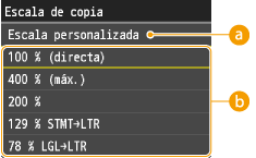 <Escala de copia> no está disponible cuando se utiliza <Copia de carné> o <Selección auto papel (LTR/LGL)>. |