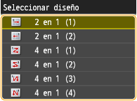El uso de <2 en 1>/<4 en 1> reduce la escala de copia automáticamente (la relación de copia aparece en la pantalla). Puede aumentar o reducir la escala de copia antes de pulsar , pero es posible que los lados del documento no se copien si la aumenta.<2 en 1>/<4 en 1> no está disponible cuando se utiliza <Borrar marco>, <Copia de carné>, o <Selección auto papel (LTR/LGL)>. Al copiar varios documentos en una página, pueden crearse márgenes en la imagen copiada. |