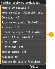 . Si cambia esta configuración predeterminada para adaptarla a las operaciones que realiza con mayor frecuencia, puede eliminar la necesidad de realizar la misma configuración cada vez que realice copias.