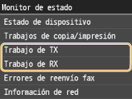 2 | Pulse el documento cuyo estado desea comprobar. ![]() <Estado de trabajos TX>/<Estado de trabajos RX>Muestra la lista de documentos que se están enviando y recibiendo o que están a la espera de procesarse. <Detalles>Muestra información detallada sobre el documento seleccionado en la lista. Si especificó varios destinos, el número de destinos especificados aparece en la pantalla. Para consultar los detalles de los destinos especificados, pulse <Número de destinos>. Si encuentra un documento innecesario, pulse <Cancelar> o <Eliminar> y pulse <Sí>. |