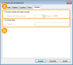 [Incluir número de hojas a enviar]Seleccione esta casilla de verificación si desea incluir el número de hojas que va a enviar en la portada y especifique el número de hojas en [Número de hojas a enviar]. El número de hojas que desea enviar no se contabiliza automáticamente. El valor especificado aquí se incluye en la portada.