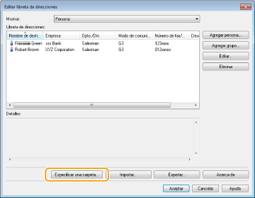 Haga clic en [Especificar una carpeta] en el cuadro de diálogo [Editar libreta de direcciones].