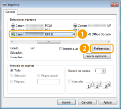 Seleccione el controlador de impresora del equipo y haga clic en [Preferencias] (o [Propiedades]).