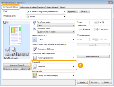 Seleccione [Intercalar] o [Agrupar] en [Acabado]