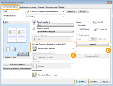 Seleccione [Impresión en cuadernillo] en [Una cara/Doble cara/Impresión en cuadernillo]